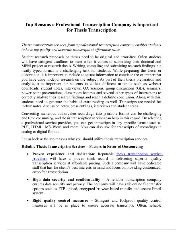 TranscriptionStar has been providing dissertation and thesis transcription to students from leading universities in United States and United Kingdom. Get the best of everything! HIPPA We are HIPAA compliant and your files are in safe hands TAT We deliver transcripts within 4,6,8 and 12 hrs TAT Big DiscountLocation: , Palomino Drive, #, Diamond Bar, , California Dissertation Interview Transcription: A Guide to Academic Transcription Services When it comes to primary research-based dissertations, interviews are often essential. You need to ensure that you get the findings you need. To help you do this, just recording the interview and making notes might not be blogger.comted Reading Time: 7 mins SIMPLE STEPS TO GET TRANSCRIPTION SERVICES UPLOAD FILES Upload audio or video files to receive a "No-obligation Quote" via e-mail. 1 PAY ONLINE We can accept payment through credit, debit card and PayPal. 2 TRANSCRIPT DELIVERY We deliver the proof read transcription to your e-mail. 3 Upload Files