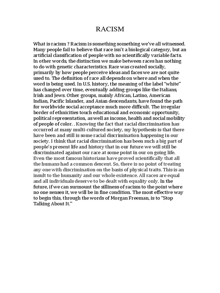 1. Gender Discrimination • Although gender discrimination has decreased a lot as compared to past but still the situation is far from ideal. • Several institutions are reluctant to give important and commanding posts to women. • Gender discrimination is also · Another concerning aspect that encompasses the practice of racial discrimination is institutional racism. It is defined as the act that perpetuates treating people differently pegged on their social, economic, and spiritual backgrounds. We will write a custom essay specifically for you for only $ $11/page certified writers online · 10 Lines on Discrimination Essay in English 1. Discrimination is an act when a person is treated unequally and differently. 2. Stereotype and prejudice are not discrimination. They are a part of the discrimination spectrum. 3. Particular forms of discrimination are also punishable by law. 4